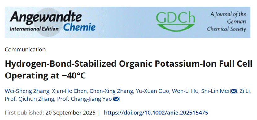 近日,澳彩网-澳彩app-澳门彩票网官方平台 姚长江团队在国际顶级期刊《德国应用化学》(Angewandte Chemie International Edition)发表题为” Hydrogen-Bond-Stabilized Organic Potassium-Ion Full Cell Operating at −40°C”的研究论文(DOI: 10.1002/anie.202515475),该工作第一作者为北京理工大学博士研究生张卫生,通讯作者为姚长江教授和梅仕林研究员。