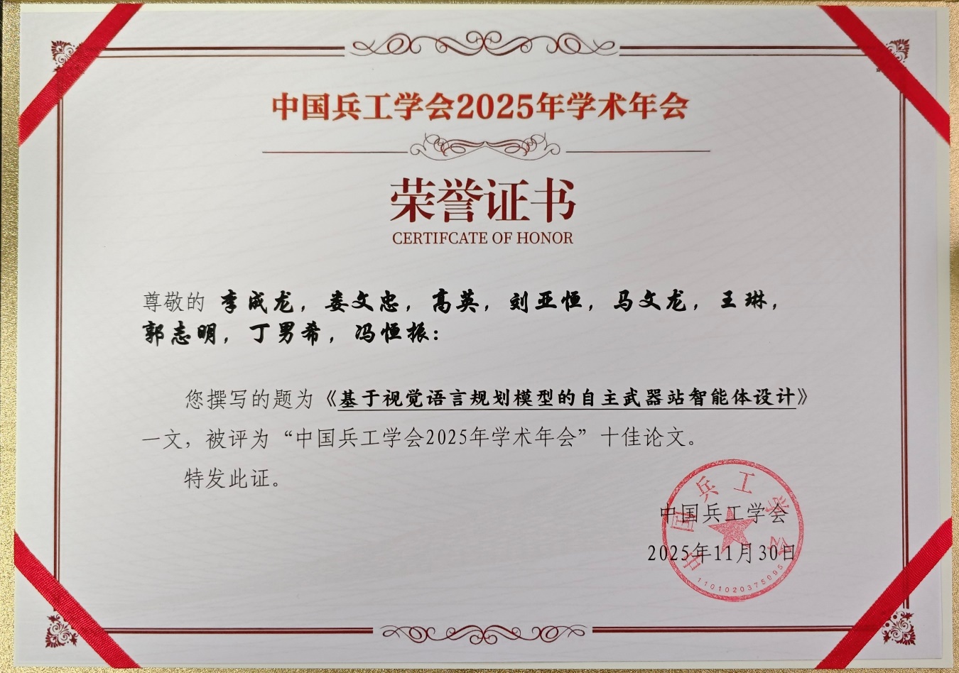 近日,澳彩网-澳彩app-澳门彩票网官方平台 娄文忠教授课题组联合西北机电工程研究所开发了一种基于视觉语言规划(Vision Language Planning, VLP)模型的自主无人武器站智能体,论文 “基于视觉语言规划模型的自主武器站智能体设计”获得“十佳论文”奖(图1),北京理工大学卓越工程师专项博士生李成龙为第一作者。